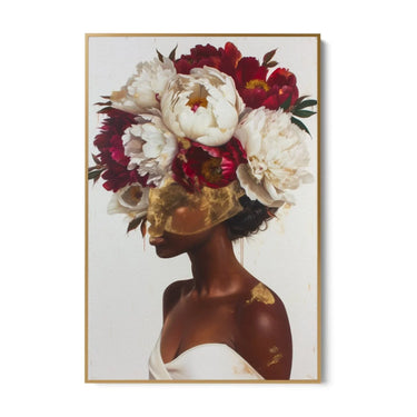 Valged ja punased lilled, mis kaunistavad naise pead, on domineerivad värvid, luues elava kontrasti tema tumeda naha vastu. Kuldvärvilised pintslitõmbed lisavad luksust ja peenetundelisust, rõhutades näo ja keha kontuure.
