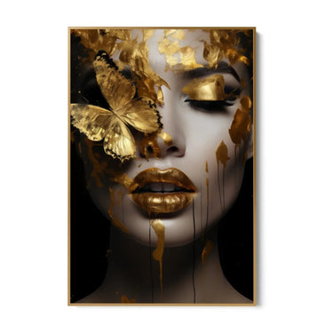 Peamised kasutatud toonid on sügav must ja särav kuldne. Naise nägu on osaliselt kaetud kuldsete lehtedega, mis näivad sulanduvat tema nahaga, samal ajal kui elegantne kuldne liblikas istub õrnalt tema vasakul silmal. Kuldsed huuled lisavad kogu kompositsioonile luksust ja peenetundelisust.