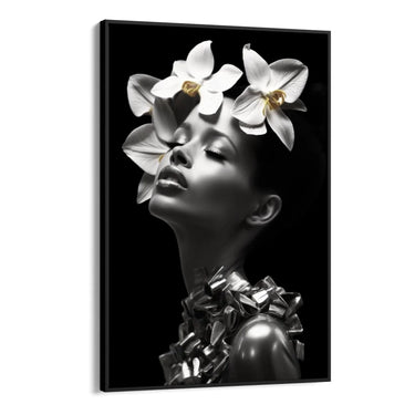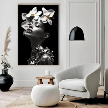 Valitsevad värvid on valge ja must, luues monokroomse efekti, mis rõhutab pildi puhtust ja lihtsust. Valged orhideed, mis on paigutatud kujutise pea kohale, lisavad värskust ja elujõudu, murdes valge ja musta monotoonsust oma õrna kohalolekuga.