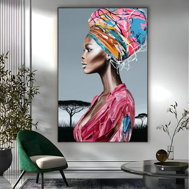 "Turbante Cromatico" on lõuenditrükk, mis tabab naiselikkuse ilu ja jõu olemust. Maal kujutab naist profiilis, rahuliku ja kindla ilmega. Tema tume nahk kontrasteerub suurepäraselt heleda taustaga, luues võimsa visuaalse efekti.