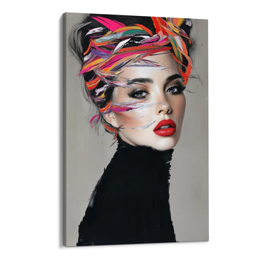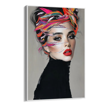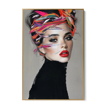 "Maali "Vortice Vivo" on erakordne lõuenditrükk, mis tabab naiselikkuse ilu ja elegantsi olemust. Kompositsioon kujutab naise portreed magnetilise pilguga, mida iseloomustavad intensiivselt punased huuled ja läbistavad silmad. Nägu on raamitud erksate värvide plahvatusega, mis põimuvad juustes, luues keerise ja dünaamilise efekti."
