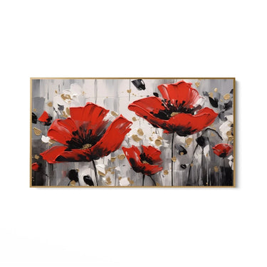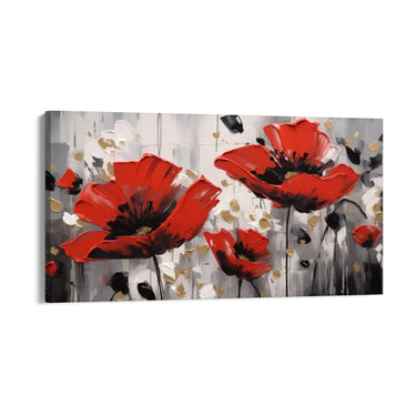 Maalile valitsev värvipalett on intensiivse punase lilledega, mida täiendab taustal musta ja halli puudutus, lisades sügavust ja kontrasti. Väikesed valge ja kuldse aktsendid on lõuendil laiali laotatud, andes teosele elegantsi ja peenetundelisust.