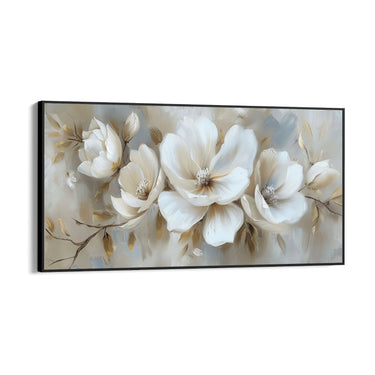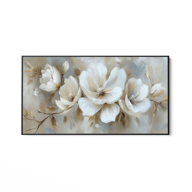 Selle maali valdavaks värviks on valge, kuldne ja beeži varjundid. Valged lilled on maalitud peenete detailidega, mis rõhutavad nende õrnust, samal ajal lisavad kuldsed lehed luksuslikku ja rafineeritud puudutust. Neutraalsetes toonides hägune taust aitab esile tuua peamised motiivid, luues harmoonilise ja tasakaalustatud visuaalse efekti.