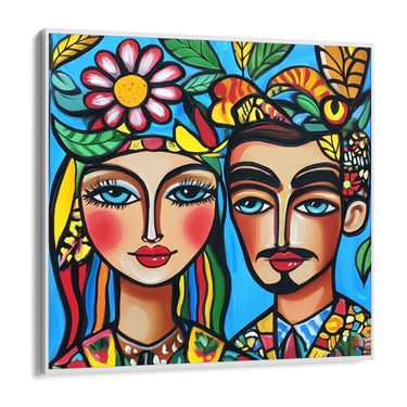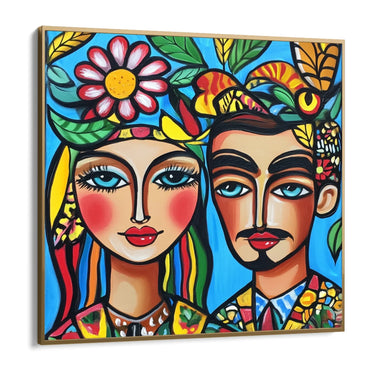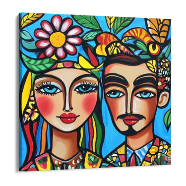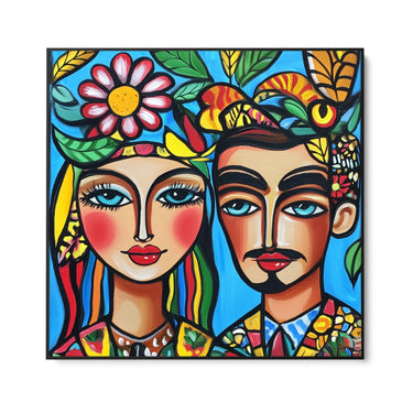 Maali kompositsioon on tasakaalustatud, kus looduslikud elemendid nagu lilled ja lehed ümbritsevad paari nägusid, sümboliseerides harmooniat ja ühendust loodusega. See kunstiteos on ideaalne neile, kes soovivad lisada oma eluruumile värvi ja isikupära.