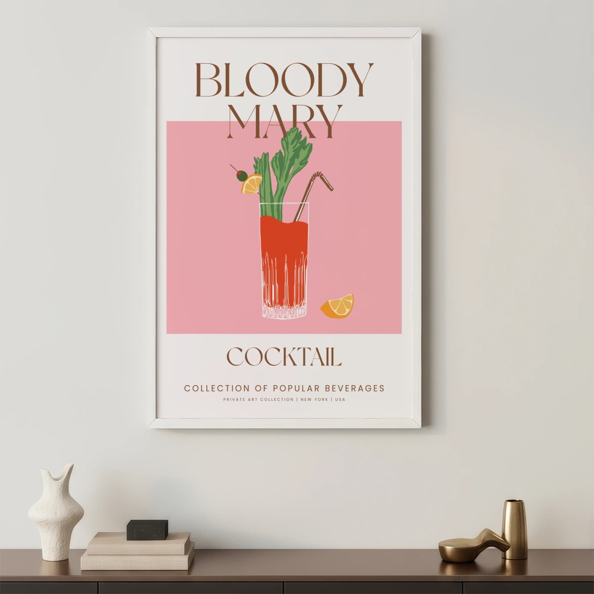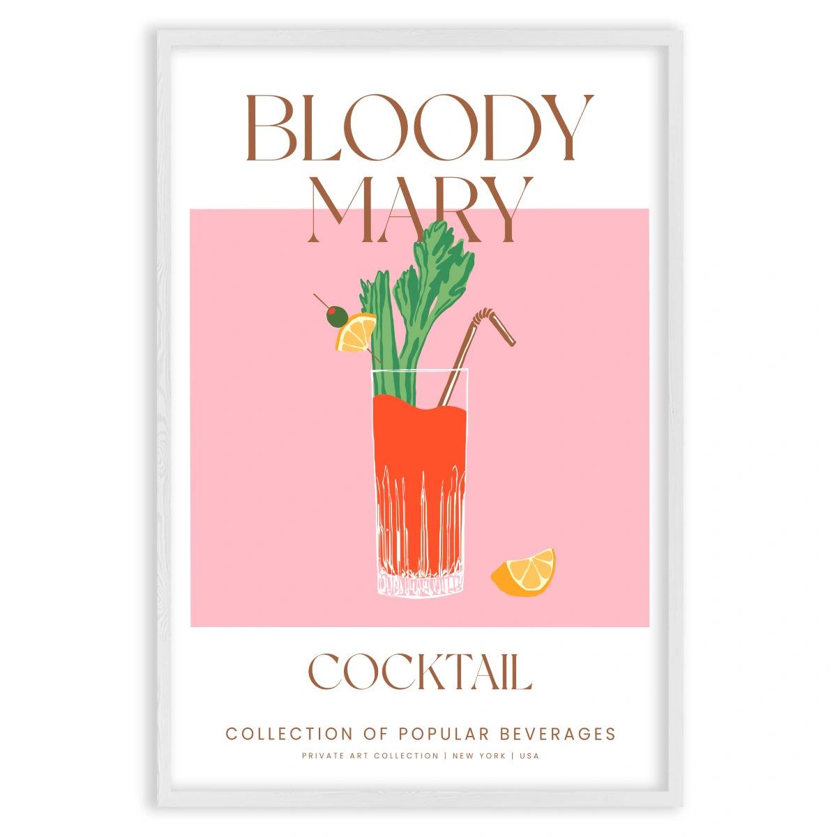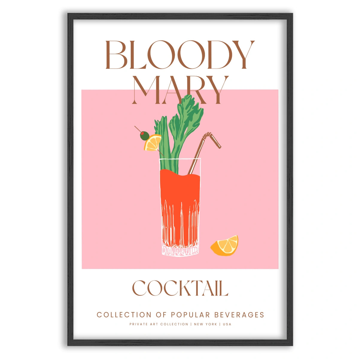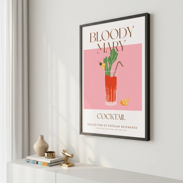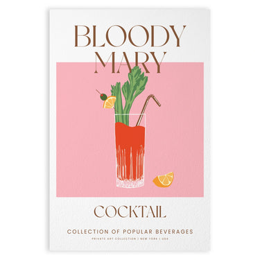 Plakati domineerivad värvid on elav Bloody Mary punane, särav selleriroheline ja apelsinilõikude oranž. Taust on õrn pastellroosa, mis loob elegantse ja köitva kontrasti kokteili värvidega.
