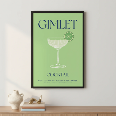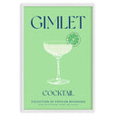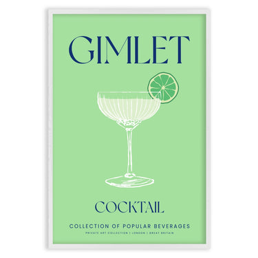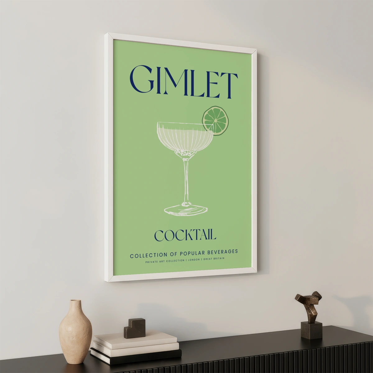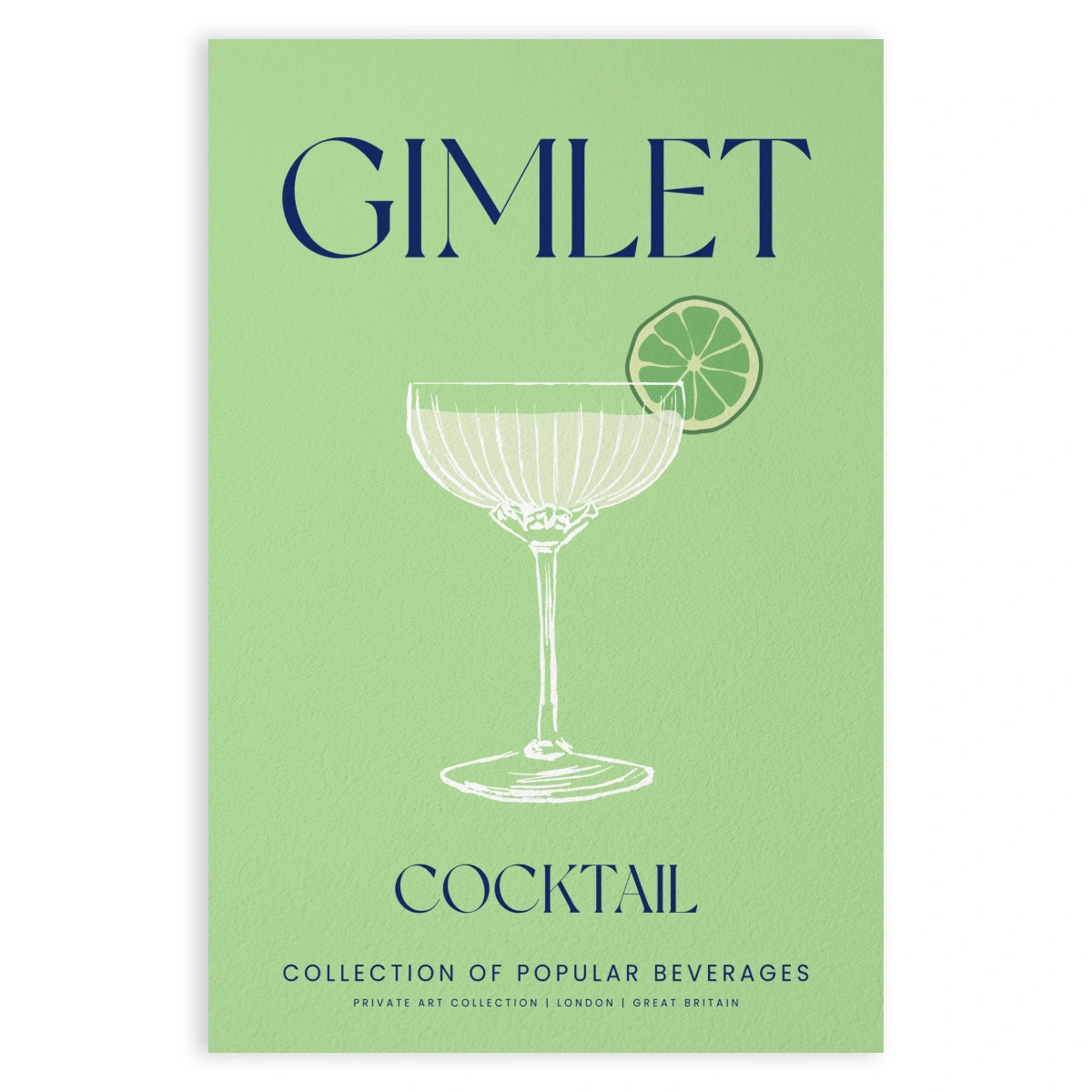 "See Plakat kujutab elegantset Gimlet-kokteili. Disain on minimalistlik ja peen, domineerivad heledad rohelised ja valged toonid."