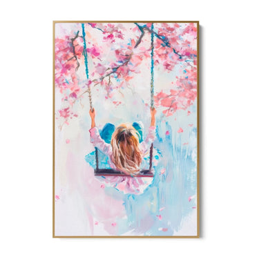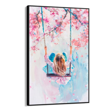 Selle lõuenditrüki valdavates värvides on pastelsed roosa, sinise ja valge toonid. Roosat kasutatakse peamiselt puude õite kujutamiseks, luues kevadise õitsemise efekti. Sinine ja valge segunevad harmooniliselt, et kujutada tausta ja tüdruku riietust, andes kogu kompositsioonile rahu ja värskuse tunde.