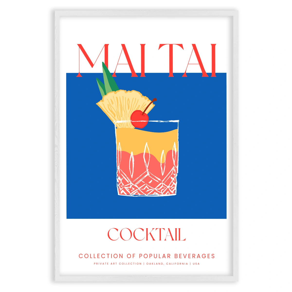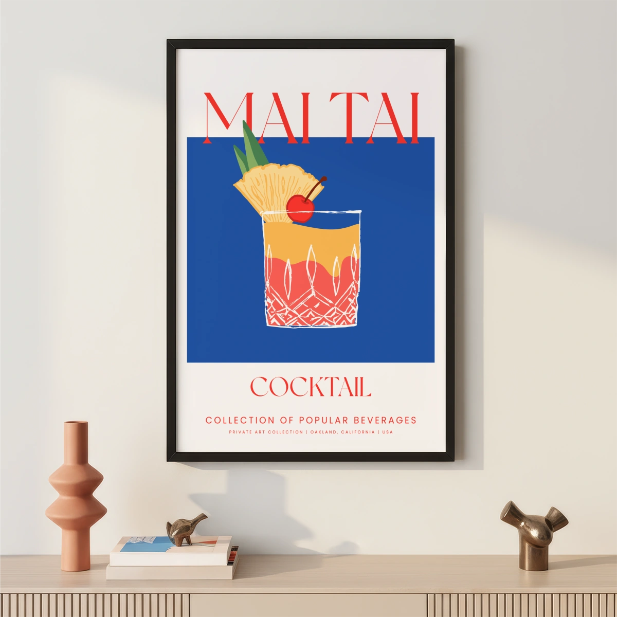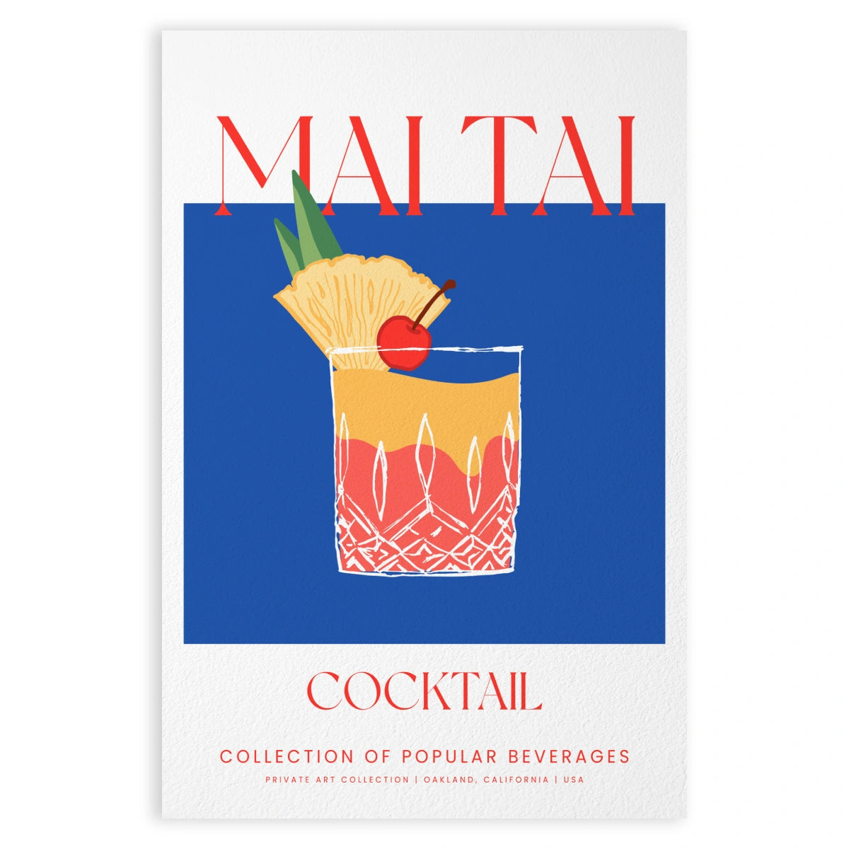 Kokteili kaunistab ananassiviil, punane kirss ja rohelised lehed, mis lisavad kompositsioonile eksootilise puudutuse. Kirjutis "Mai Tai" erkpunases asub Plakati ülaosas, samas kui sõna "Cocktail" ja muud andmed on paigutatud allosas, samuti punases.