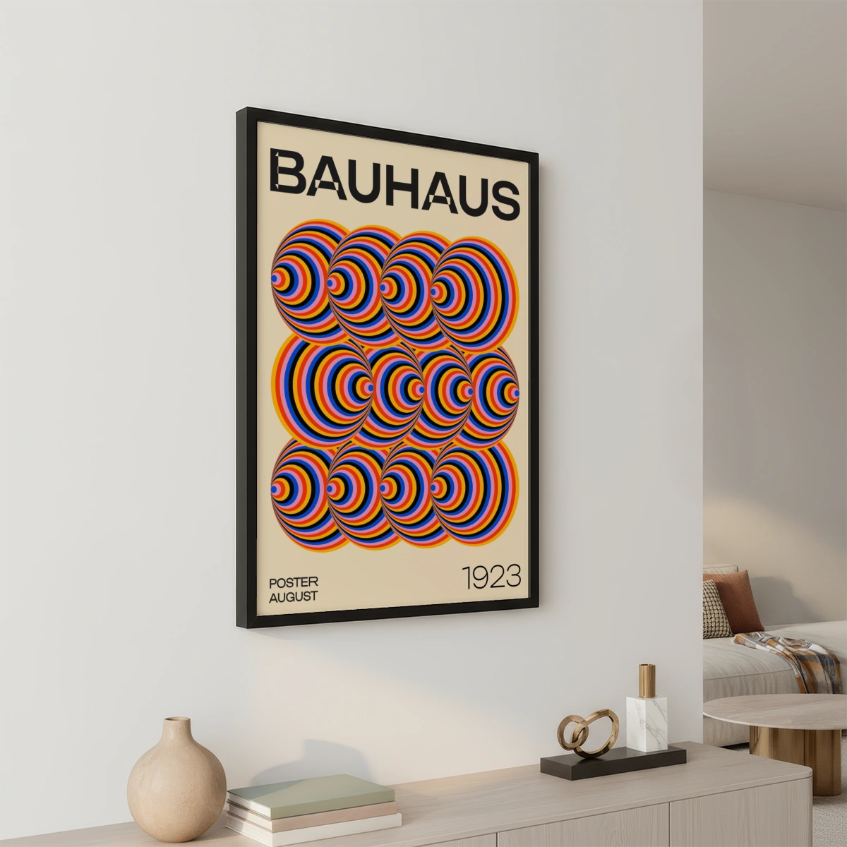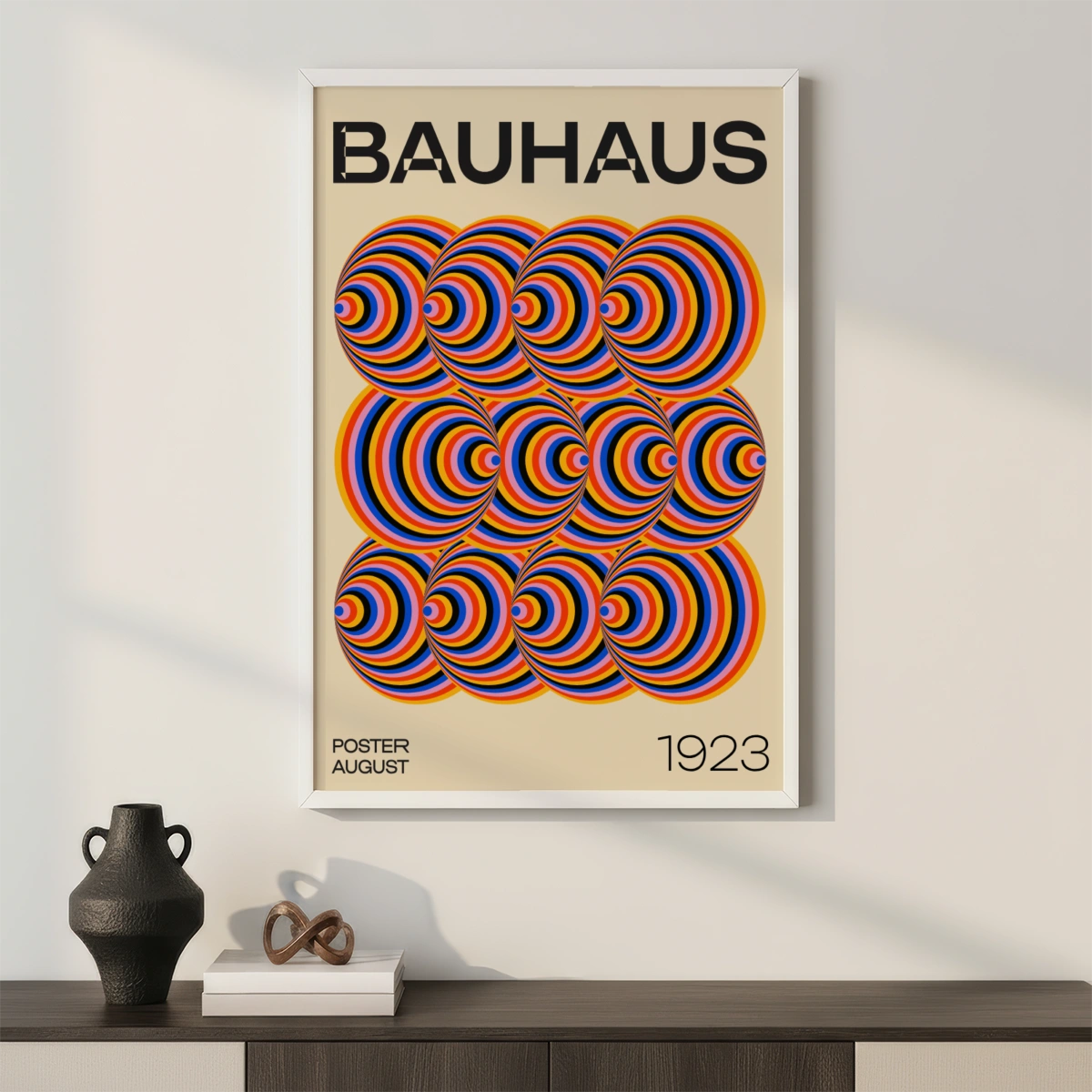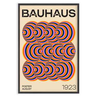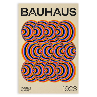 Pealkiri "BAUHAUS" on paigutatud Plakati ülaossa paksudes mustades tähtedes. Vasakus alanurgas on kiri "POSTER AUGUST", samal ajal kui paremas alanurgas on aastaarv "1923". Plakati taust on neutraalse värvusega, mis toob esile rõõmsad ringide värvid.