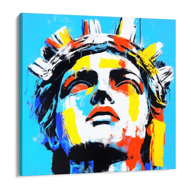 Tugevad ja otsustavad jooned määratlevad näojooned, andes edasi võimu ja autoriteedi tunnet. Pea kohal olev valguskiirte kroon viitab kuninglikule või jumalikule figuurile, tõstes teose tähendust veelgi. See lõuenditrükk sobib ideaalselt neile, kes soovivad lisada oma koju või kontorisse elegantsi ja intensiivsust.