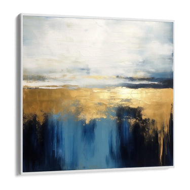 Sävellys näyttää edustavan kaukaista horisonttia, jossa taivas kohtaa maan. Maalauksen keskellä olevat kultaiset siveltimenvedot viittaavat auringonsäteiden valaisemaan maisemaan, mikä tuo lämpöä ja kirkkautta. Maalauksen alaosan siniset sävyt lisäävät syvyyttä ja kontrastia tehden työstä täydellisen teoksen rikastuttamaan mitä tahansa ympäristöä eleganssilla ja tyylillä.