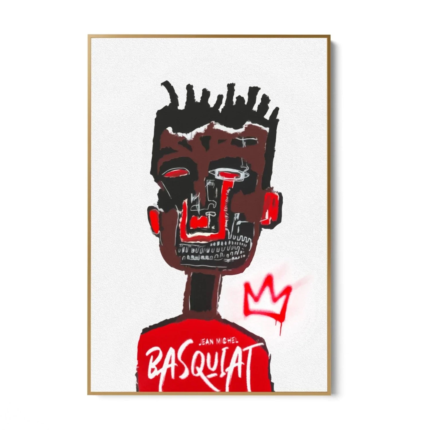 Les couleurs prédominantes dans ce tableau sont le noir, le rouge et le blanc. Le noir est utilisé pour créer le contour et les détails du visage, tandis que le rouge vif accentue certaines parties du visage et le t-shirt, sur lequel le nom « Basquiat » est écrit en blanc. Le fond blanc met en valeur l’ensemble de la composition, créant un fort contraste visuel.