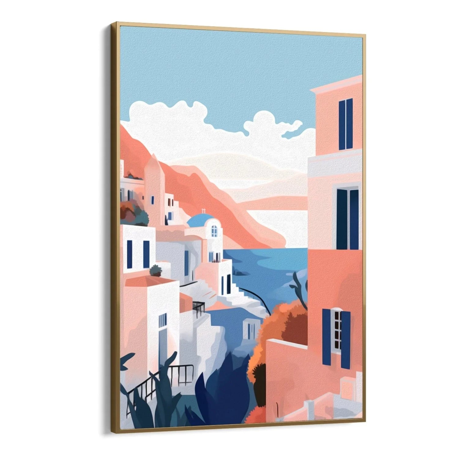 Ovaj otisak na platnu prikazuje prekrasan pogled na Santorini, grčki otok poznat po plavo-bijelim kućama i prekrasnim pogledima na more. Prizor dočarava srž mediteranskog života sa slikovitim zgradama koje gledaju na uske uličice i stepenicama koje vode do kristalno čistog mora.