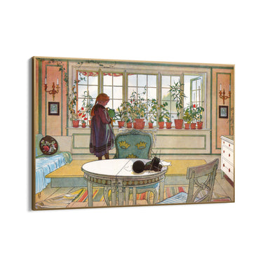 "Cvjetni prozor" Carla Larssona je tiskana platna koja hvata trenutak kućnog života s velikom nježnošću i pažnjom prema detaljima. Scena prikazuje svijetlu i ugodnu sobu, koju dominira veliki prozor kroz koji ulazi toplo i prirodno svjetlo.