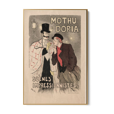 Slika pod nazivom "Mothu et Doria" Théophilea Alexandrea Steinlena prikazuje živahnu i fascinantnu scenu, tipičnu za impresionistički stil. Otisak na platnu prikazuje dvojicu muškaraca u elegantnoj odjeći koji razgovaraju ispod ulične svjetiljke. Jedan od likova nosi kaput na kockice i cilindar, dok je drugi odjeven u tamni kaput i kapu.
