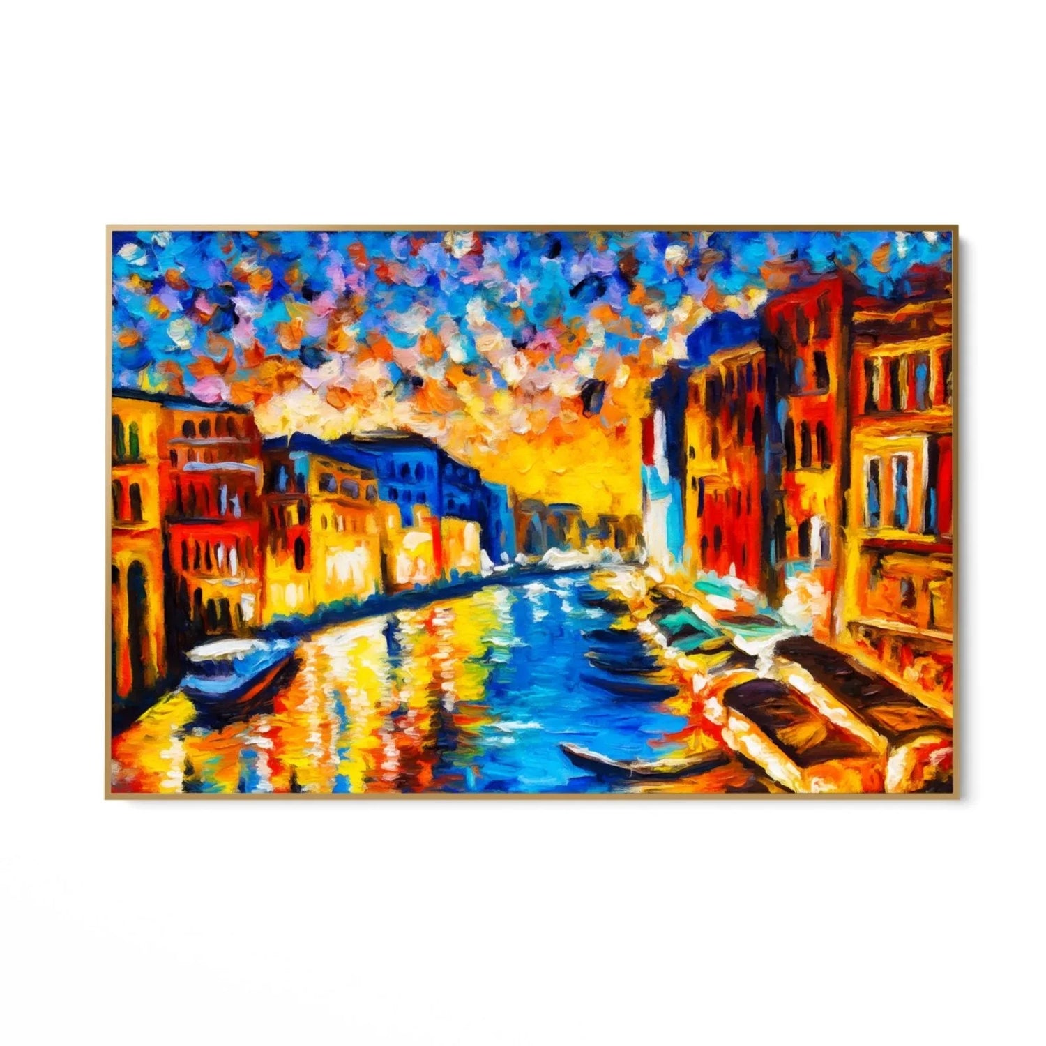 Scena predstavlja trenutak tišine i ljepote u gradu koji gleda na kanal. Usidreni brodovi i osvijetljene kuće sugeriraju gostoljubivo i spokojno okruženje, dok šareno nebo dodaje dašak magije i romantike.