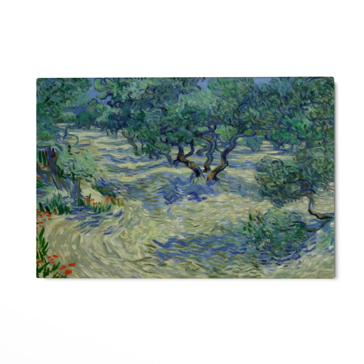Ovaj otisak na platnu predstavlja sliku "Maslinov vrt 1889" Vincenta Van Gogha koja prikazuje maslinik sa stablima zakrivljenih oblika i valovitim krajolikom koji odaje pokret i vitalnost.