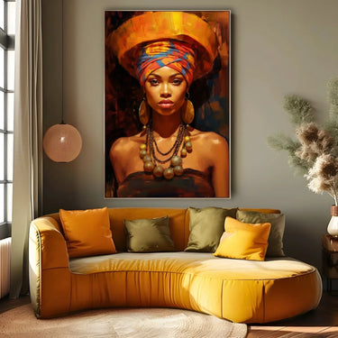 "Afrička harmonija" je tiskana slika na platnu koja hvata bit i ljepotu afričke kulture. Glavna junakinja slike je ponosna i dostojanstvena žena, s intenzivnim i prodornim pogledom. Nosii šareni pokrivalo za glavu koje miješa žive nijanse narančaste, plave i žute, simbol vitalnosti i tradicije.