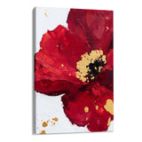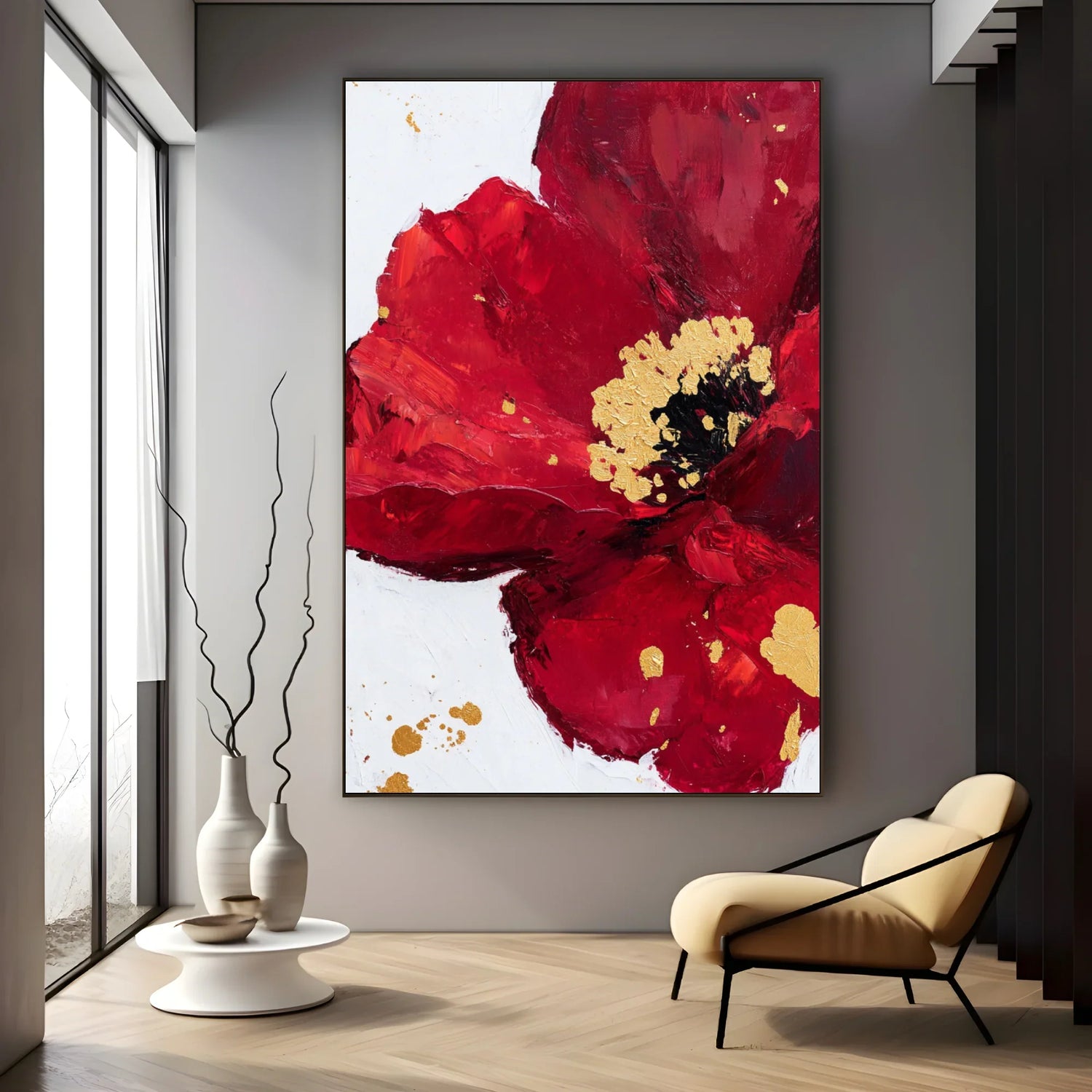 Glavne boje korištene u ovom djelu su intenzivno crvena i čista bijela, s dodirima zlata koji dodaju element luksuza i profinjenosti. Živahna crvena boja cvijeta prekrasno kontrastira s bijelom pozadinom, stvarajući snažan i dinamičan vizualni efekt. Zlatne mrlje razasute po platnu dodaju dodir elegancije i pokreta.