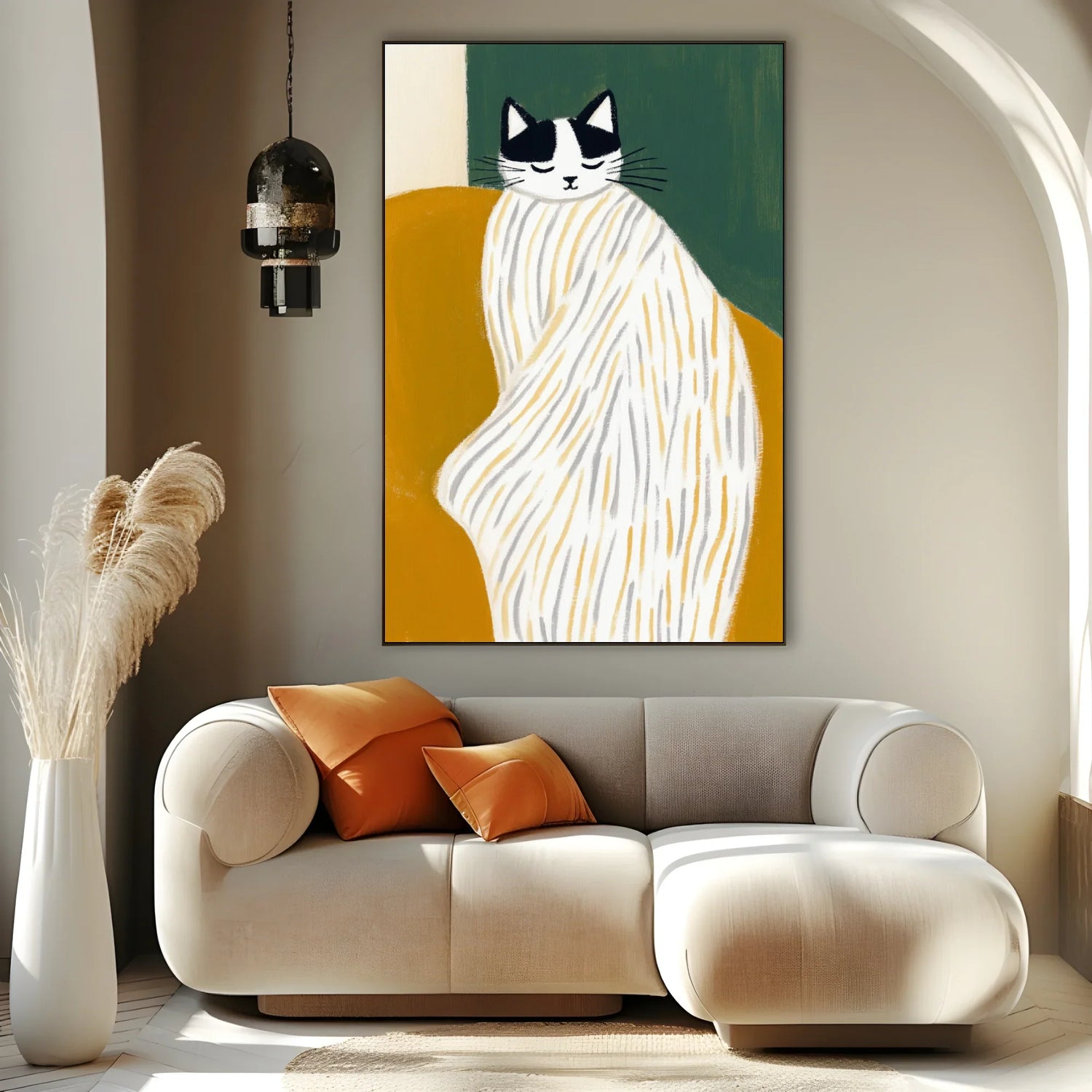 Ovo djelo predstavlja mir i gracioznost mačaka, hvatajući trenutak tišine i introspekcije. Fluidne linije i tople boje prizivaju osjećaj smirenosti i udobnosti, čineći ga savršenim dodatkom za bilo koji kućni ili radni prostor.