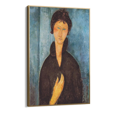 Ovaj otisak na platnu predstavlja jedan od poznatih portreta Amedea Modiglianija pod nazivom "Žena plavih očiju". Djelo hvata bit ženske figure s elegancijom i jednostavnošću koja je tipična za umjetničin stil.
