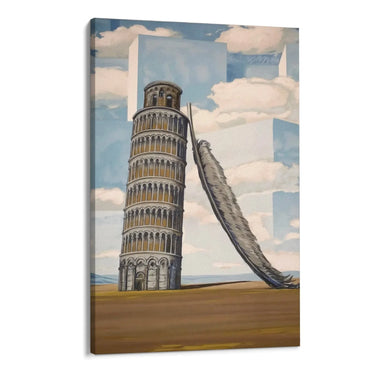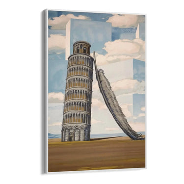 Toranj u Pisi oslikan je s realističnim detaljima, dok se čini da neproporcionalno veliko pero prkosi zakonima fizike. Plavo nebo s pahuljastim oblacima dodaje dašak vedrine prizoru, stvarajući intrigantan kontrast s nadrealnim elementima.