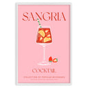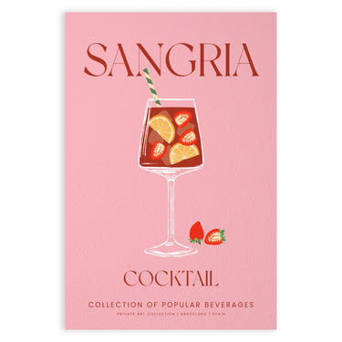 Tekst "Sangria" napisan je velikim i podebljanim tamnocrvenim slovima na vrhu Poster-a. Ispod čaše, riječ "Cocktail" istaknuta je istom tamnocrvenom bojom. Na dnu se nalazi natpis "Collection of Popular Beverages", nakon čega slijedi "Private Art Collection | Barcelona | Španjolska".