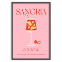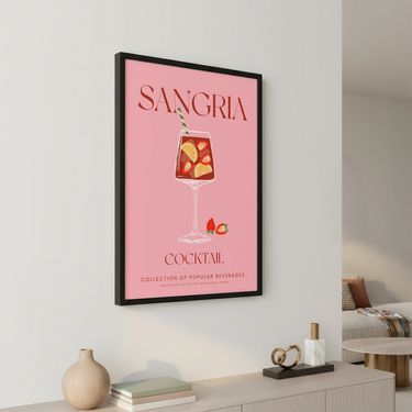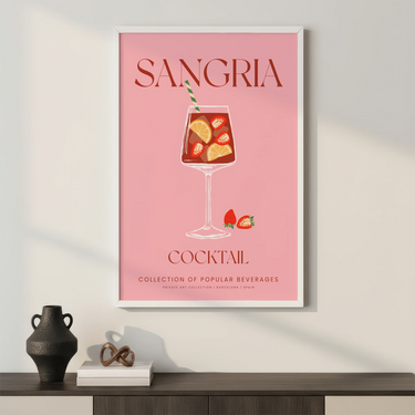 Poster prikazuje elegantnu čašu Sangrie, jednog od najikoničnijih i najpopularnijih pića. Čaša je ilustrirana živopisnim detaljima, s kriškama limuna i jagoda koje plutaju u intenzivno crvenom tekućem Sangria.
