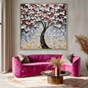 A műalkotásban használt színek élénkek és kontrasztosak. A fa leveleit fehér és piros árnyalatokra festették, így szemet gyönyörködtető vizuális hatást keltenek. A hátteret világoskék, szürke és sárga árnyalatok kombinációja alkotja, amelyek mélységet és dimenziót adnak a festménynek.