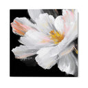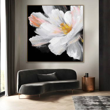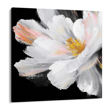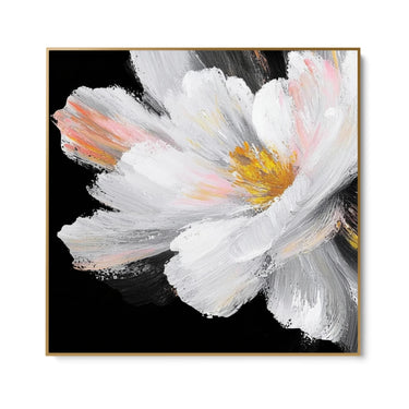 Pagrindinės spalvos yra balta ir juoda, sukuriantys žavų ir rafinuotą kontrastą. Gėlės žiedlapiai nupiešti balto, pilko atspalviais bei rožinės ir geltonos spalvų potėpiais, suteikiančiais kūriniui gilumo ir realistiškumo. Juodas fonas dar labiau pabrėžia gėlės tyrumą ir lengvumą, elegantiškai išryškindamas ją.