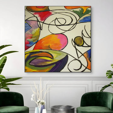 Abstraktu formu un drosmīgu krāsu kombinācija rada mūsdienīgu un izsmalcinātu atmosfēru. Šis gleznojums ir ideāls, lai pievienotu radošuma un dzīvīguma pieskārienu jebkurai telpai, vai tā būtu viesistaba, studija vai birojs.