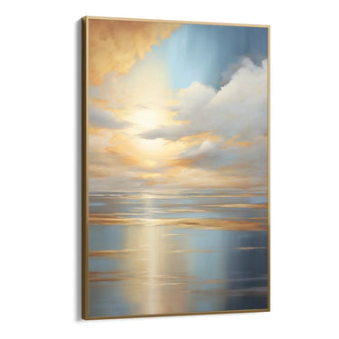 “Cosmic Introspection” is een canvasprint die de essentie van innerlijke reflectie door een hemels landschap vastlegt. Dit schilderij vertegenwoordigt een lucht bij zonsondergang, waar de wolken getint zijn met gouden en oranje tinten, waardoor een harmonieus contrast ontstaat met het diepe blauw van de lucht en de zee beneden.