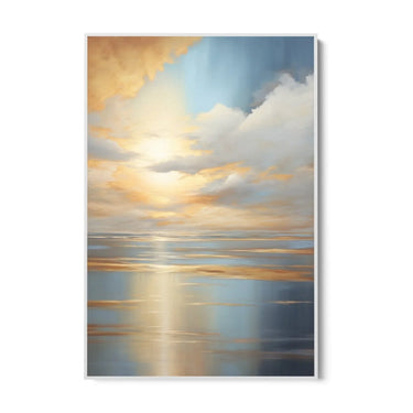 Het schilderij lijkt een moment van stilte en contemplatie weer te geven, waarin de lucht en de zee samenvloeien in een oneindige omhelzing. Het zonlicht dat op het water reflecteert, creëert een spiegeleffect, een symbool van introspectie en verbinding met het universum.