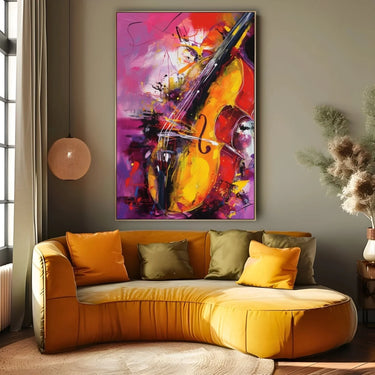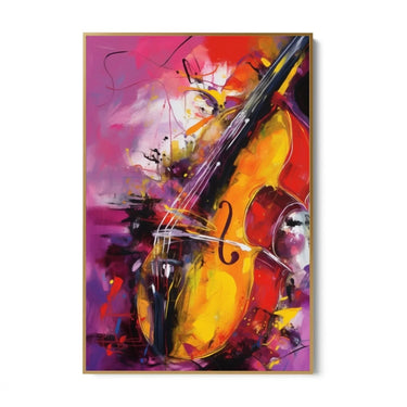 Het hoofdonderwerp van het schilderij is een viool, abstract en modern weergegeven. De vloeiende lijnen en gebogen vormen van de viool worden geaccentueerd door spatten en klodders kleur die rond het instrument lijken te dansen, waardoor de beweging en passie van de muziek worden opgeroepen.