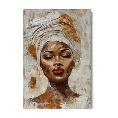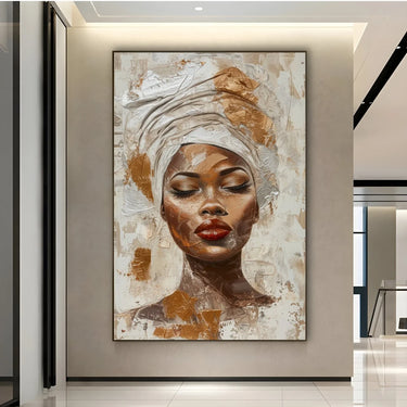 Dominujące kolory to biały oraz różne odcienie brązu i złota. Biały, używany do nakrycia głowy i tła, symbolizuje czystość i spokój. Odcienie brązu i złota, nałożone zdecydowanymi pociągnięciami pędzla, dodają ciepła i głębi obrazowi, tworząc fascynujący kontrast z karnacją kobiety.