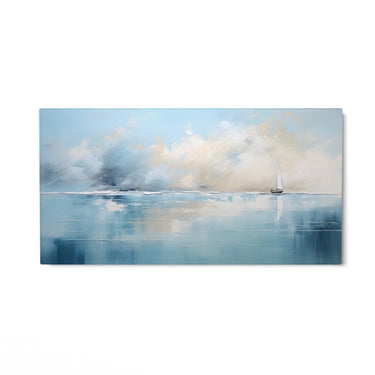 "Zawieszenia Nierealnego" to druk na płótnie, który uchwyca eteryczny i spokojny krajobraz morski. Scena przedstawia spokojne morze z samotnym żaglowcem odbijającym się na krystalicznie czystej wodzie. Niebo jest namalowane delikatnymi odcieniami błękitu, bieli i szarości, tworząc atmosferę spokoju i kontemplacji.