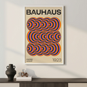 Ten Plakat przedstawia dzieło sztuki inspirowane ruchem Bauhaus z 1923 roku. Projekt charakteryzuje się serią nałożonych na siebie koncentrycznych kół, które tworzą hipnotyczny i dynamiczny efekt. Koła są ułożone w uporządkowaną siatkę, tworząc poczucie harmonii i powtarzalności.