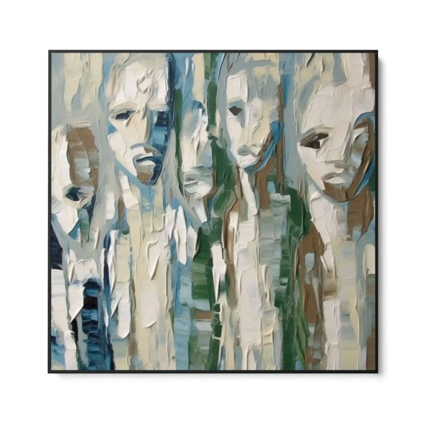 Il quadro rappresenta volti stilizzati, quasi eterei, che sembrano fluttuare in uno spazio indefinito. Le espressioni enigmatiche delle maschere evocano sentimenti di mistero e introspezione, suggerendo una profondità emotiva nascosta dietro le apparenze.