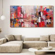 Questa opera d'arte astratta evoca un senso di movimento e energia attraverso l'uso sapiente dei colori e delle texture. Le pennellate decise e i contrasti cromatici suggeriscono un paesaggio urbano contemporaneo o un'emozione intensa, lasciando spazio all'interpretazione personale dello spettatore.