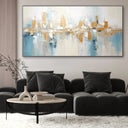 "Danças de Luz e Sombra" é uma tela que capta a essência de uma cidade moderna refletida na água. As pinceladas abstratas criam uma atmosfera dinâmica e vibrante, evocando o movimento e a vida urbana.