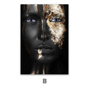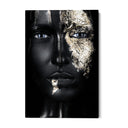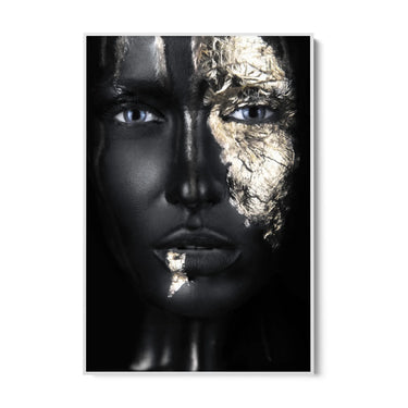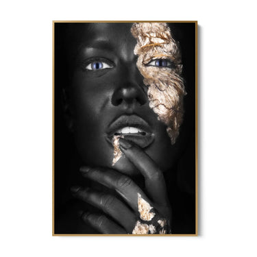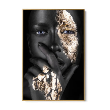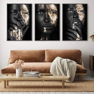 Esta impressão em tela faz parte da Gold Collection e representa uma obra de arte moderna e sofisticada. A pintura é composta por três painéis que representam rostos humanos com detalhes dourados. Os intensos olhos azuis contrastam lindamente com a pele escura dos sujeitos, criando um efeito visual fascinante e dramático.