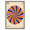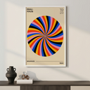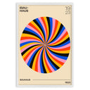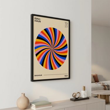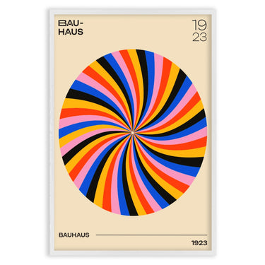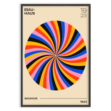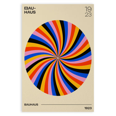 O Cartaz representa uma obra de arte inspirada no movimento Bauhaus, datada de 1923. O design central é caracterizado por uma espiral hipnótica que capta imediatamente a atenção.