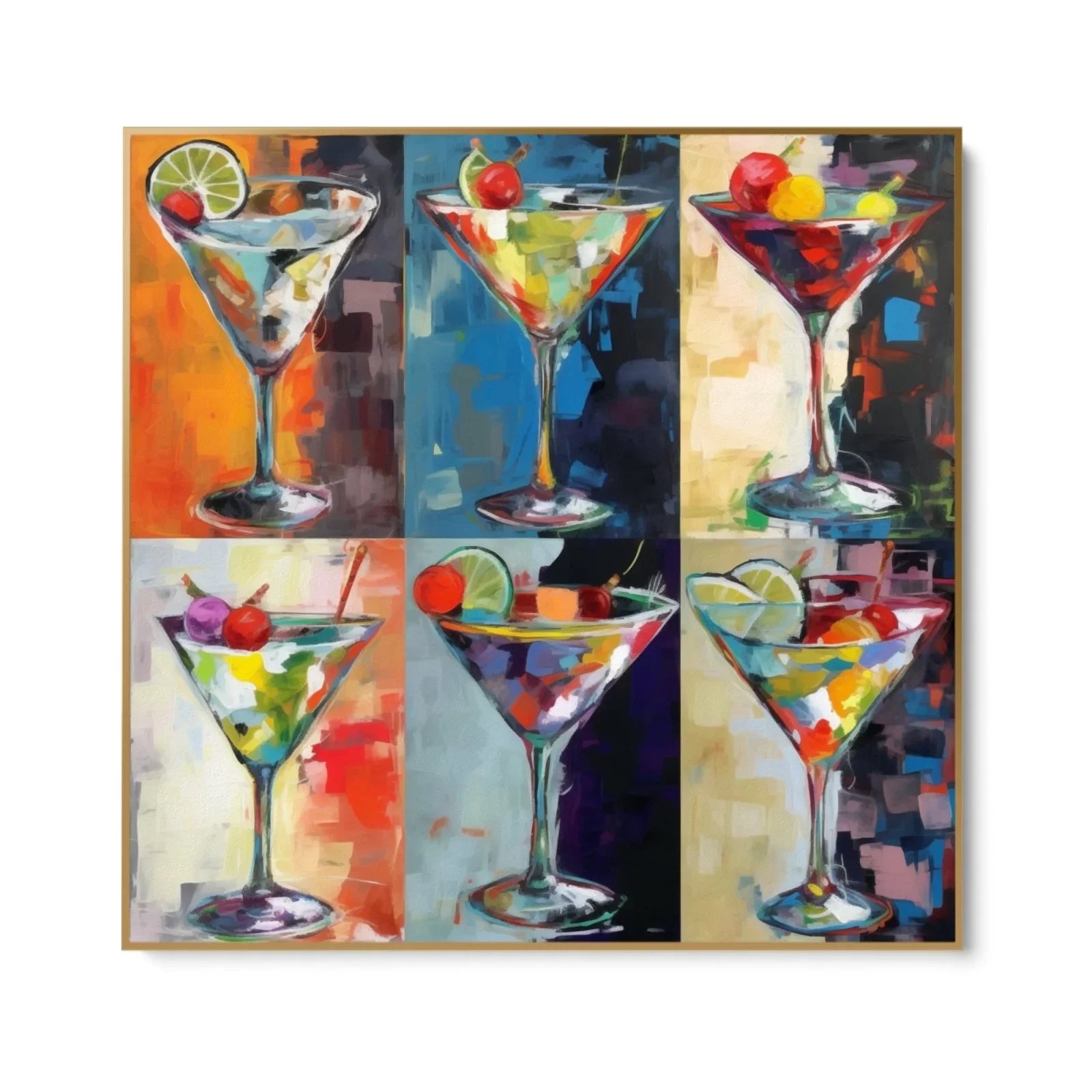 Tabloul „Pop Martini” este o imprimare pe pânză care surprinde esența vibrantă și colorată a cocktailurilor Martini. Compoziția este împărțită în șase secțiuni, fiecare având un pahar de martini decorat cu fructe precum lime și cireșe.