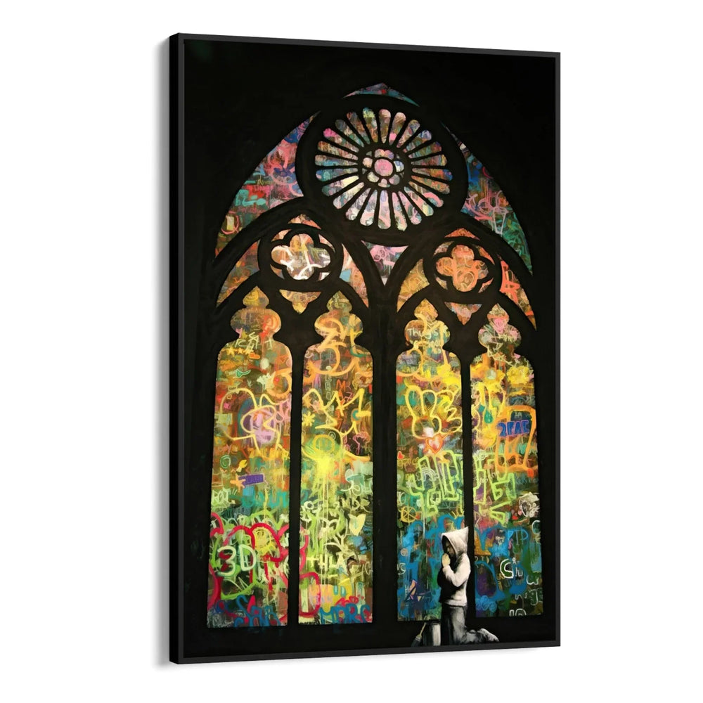 Pictura „Higher Hope” este o imprimare pe pânză care surprinde esența artei contemporane și vibrante. Scena înfățișează un vitraliu gotic, plin de detalii complicate și culori vibrante, așezat pe un fundal întunecat. Vitraliul este decorat cu graffiti modern, creând un contrast fascinant între sacru și profan.