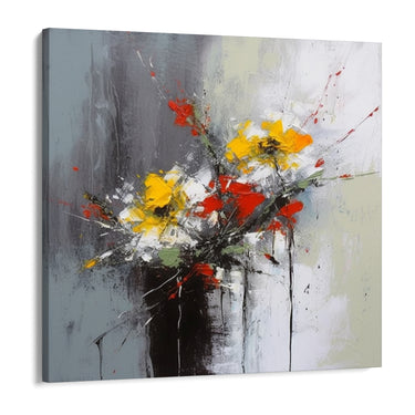 "Sosirea Primăverii" este o imprimare pe pânză care surprinde esența renașterii de primăvară. Pictura reprezintă un buchet de flori vii, cu petale galbene și roșii care se conturează pe un fundal abstract și estompat.