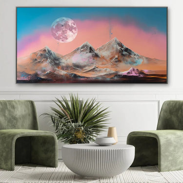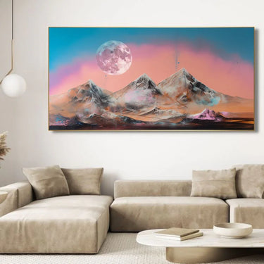 În prim-plan, munții marțieni par să iasă din pânză, datorită unei tehnici picturale care adaugă textură și dimensiune. În fundal, o lună plină mare domină cerul, insuflând un sentiment de liniște și uimire. Această imprimare pe pânză este perfectă pentru cei care doresc să adauge o notă de fantezie și aventură spațiului lor de locuit.