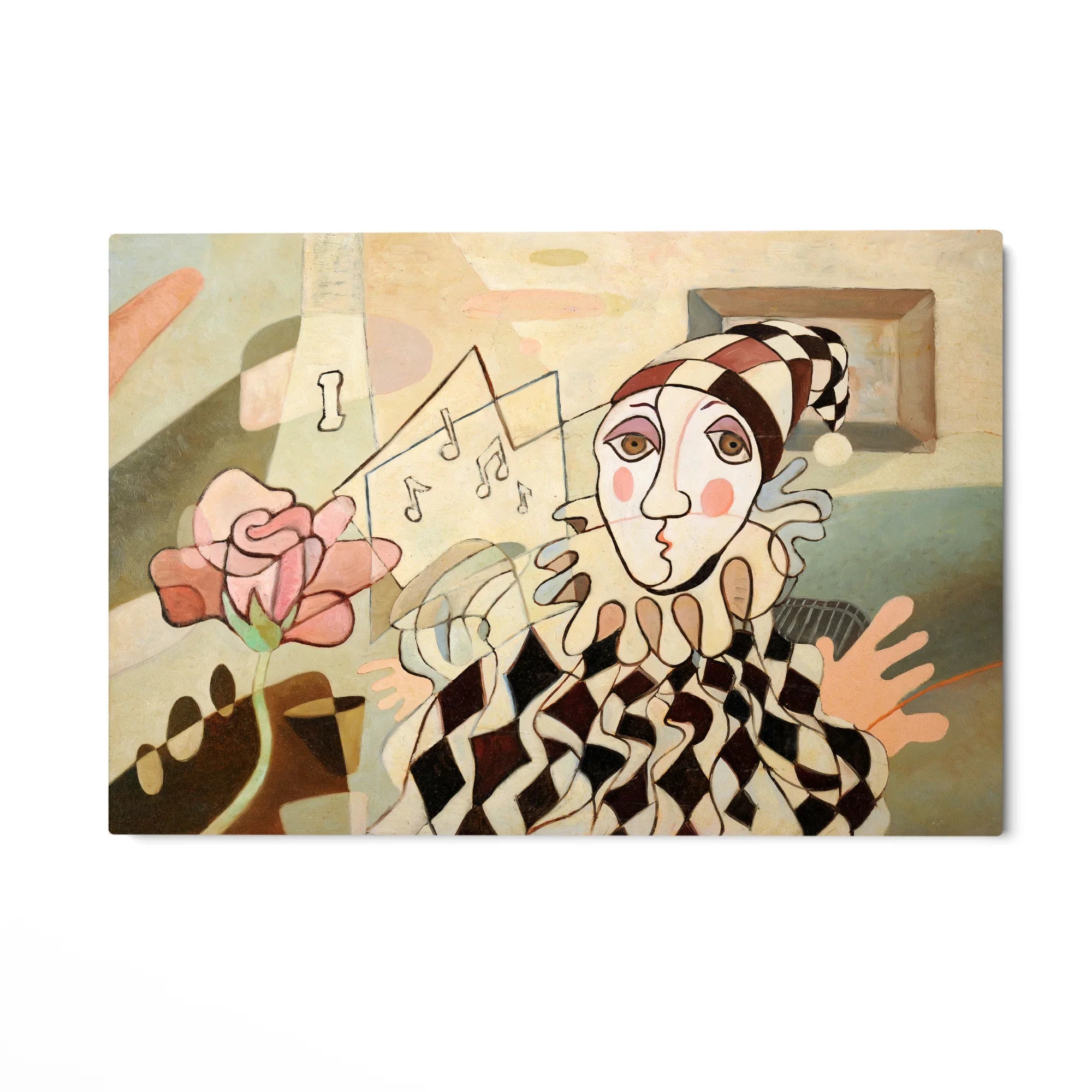 "Poznámky k maske" je tlač na plátne, ktorá zachytáva podstatu tajomstva a fantázie. Obraz zobrazuje postavu v maske, typickú pre komédie dell'arte, s enigmatickou tvárou a čierno-bielym šachovnicovým oblečením. Výraz postavy je sladký a melancholický, s ružovými lícami, ktoré pridávajú nádych nežnosti.