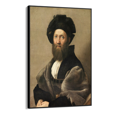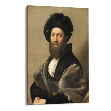 Baldassare Castiglione är avbildad med ett lugnt och eftertänksamt uttryck, iklädd en elegant och praktfull dräkt som speglar hans höga sociala ställning. Hans direkta och genomträngande blick fångar betraktarens uppmärksamhet, medan den avslappnade handställningen antyder en lugn och självsäker personlighet.