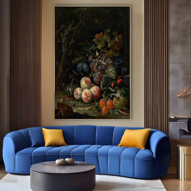 Denna canvastavla föreställer en stilleben skapad av den berömda konstnären Abraham Mignon. Målningen fångar en överflöd av frukt omsorgsfullt arrangerad på ett bord, vilket skapar en rik och överdådig atmosfär.