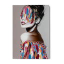 De dominerande färgerna är livfulla och kontrasterande. Penseldragen som täcker figurens ansikte inkluderar nyanser av rött, blått, gult och rosa, vilket skapar en explosion av färger som smälter samman harmoniskt. På figurens kropp är färgerna mer dämpade och mjuka, med nyanser av brunt och beige som tillför djup och realism.